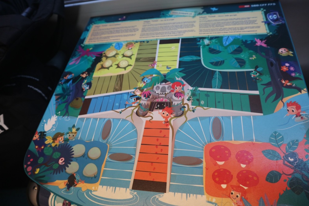 テーブル付四人掛け座席のテーブルにはスゴロクゲームのような絵が描いてあります。遊び方の説明も書いているようでしたが私の語学力不足でわかりませんでした。