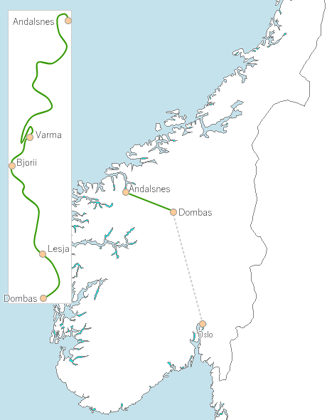 | Andalsnesは沿岸急行船が発着するMoldeや空港のあるAlesundへ行く為の交通の要所。 |