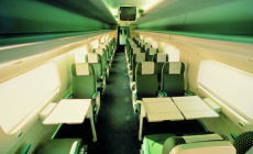 オープンサロンタイプの通路挟んで1席+2席の配置。車両の中心に1か所だけテーブル付座席があります。座席は固定されていてJRの新幹線のように回転しません。