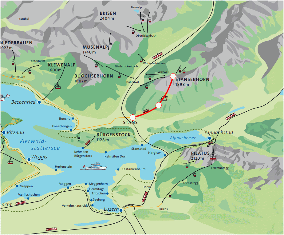 | ルツェルン湖の南に位置する標高約1900mのシュタンザーホルン山頂へ行くためのロープウェイ。 |