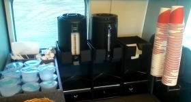 2等座席との違いは、ドリンクバーがあり、コーヒー・紅茶・新聞の無料サービスがあります。 |